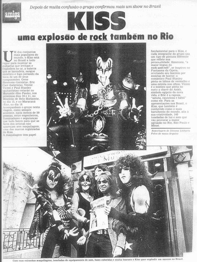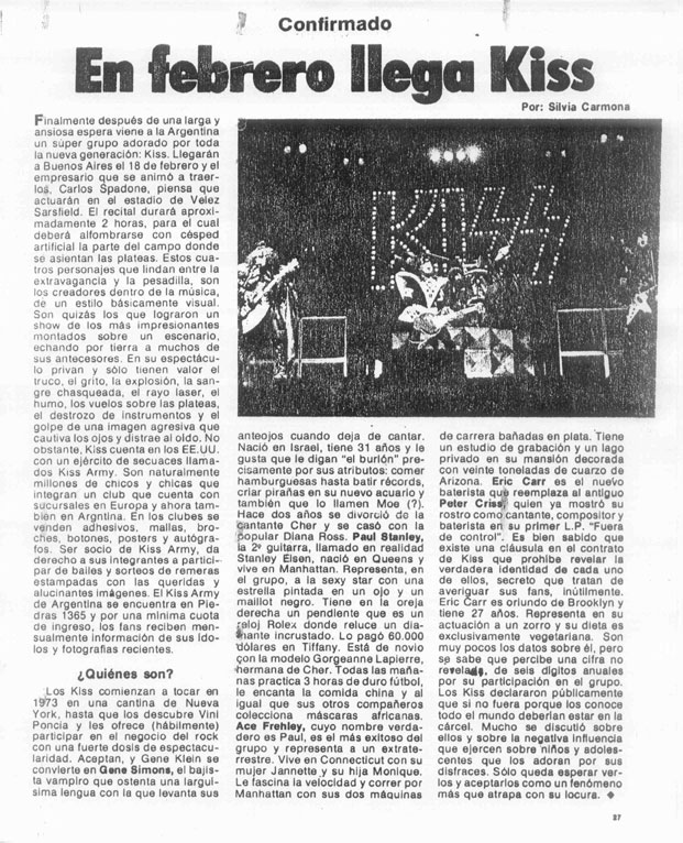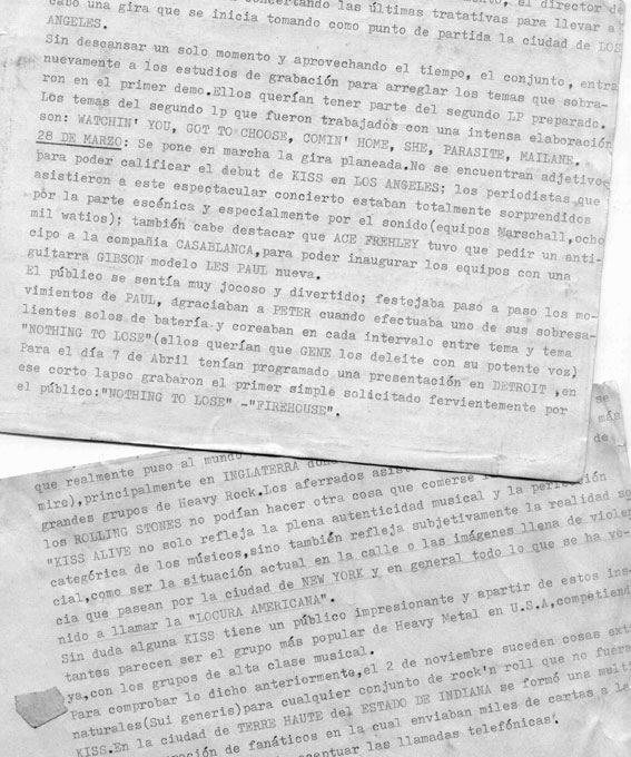 les escribe, Como verán, estábamos a full, para qué negarlo, y debo reconocer que en esos días hubo una especie de “fanzine” que revolvió nuestras neuronas. Aquí en Buenos Aires, en alguna cueva de refugiados, existía un fan club que editaba la “Kissmania”, un tipo de gacetilla tamaño bolsillo en calidad fotocopia que devorábamos con pasión deportiva. También por esos tiempos conseguir material genuino como un concierto “bootleg” era una hazaña, pero un tal Gustavo de Belgrano y Jujuy tenía el long play doble original de “Kiss Takes Tokio ‘77” y el “Fried Alive! 74”, y que si querías comprarlos, ¡el flaco te hacía las copias en vinilo! (esa no la tenían eh?). Otro punto de encuentro era un sótano a media cuadra del Obelisco que luego fue conocido como “Teatro del Plata”, y allí nos pasaban el video Live Tokio 77, mucho antes de que existieran los videobar como Vinicius. Les puedo asegurar que eso era tocar el cielo con las manos. Buscar fotografías o reportes periodísticos “de afuera” era una gesta que rozaba con lo milagroso. No puedo evitar ver a esos dos adolescentes - a un Martín Zamorano con pelo y yo todavía con todos mis dientes!!!- recorriendo Florida y Lavalle de punta a punta para adquirir revistas importadas carísimas como Hit Parader, Circus, Pop Rocky, Rock Scene, Bravo o Creem, y contentarnos con alguna fotito por más mínima que sea. Para que puedas imaginarte, sin internet, amenazados de bomba y en plena crisis de la importación, KISS estaba literalmente prescripto. Moríamos en lo de siempre: TV Semanal, TV Guía, Gente, Semanario y otros tantos pasquines de ultraderecha que se dedicaban a escribir una historia basada en la bufonada y el terrorismo amarillista. Comprábamos igual. Era lo que había y masticábamos bronca cuando leíamos cosas como: “Paul Stanley, hobbie preferido: andar en bicicleta y asustar ancianas”. Aún así siempre nos la rebuscábamos para conseguir material, y llegó un punto en el que se nos ocurrió la quijotesca idea de conformar un archivo de datos (digo “quijotesca” porque realmente vivíamos hipnotizados por estos héroes del rock’n roll). Ocurre que, cuando año tras año recibís tanta humillación y contaminación periodística, la única manera de vencerla es empezar a forjar tu propia historia de KISS. Así que nuestro nuevo entretenimiento pasó a ser “la compilación”. La PC ha facilitado mucho las cosas hoy, pero en la era de “las máquinas de escribir” solíamos despacharnos horas en el comedor de la casa Miguel copiando información que luego era clasificada y ordenada en forma cronológica. Eran hojas tamaño oficio escritas con toda la historia al frente y fotos pegadas al dorso. Lo mejor es que nuestros viejos no nos ponían restricciones, claro... se pensaban que nos matábamos estudiando. En cuanto al trabajo de selección y compilación, uno de los obstáculos que tuvimos que sortear era identificar la información fidedigna de la trucha. Qué medios inventaban y cuáles filtraban declaraciones verdaderas. Y eso nos llevó a preguntamos de dónde obtenían la información... “¿de dónde sacan estas historias y estas fotos?” Allí empezamos a intuir que las grandes editoriales que recibían cables y servicios noticiosos, incautaban el material posta y sólo usaban las fotos para esas notas “pedorras” inventadas con tal de generar “morbo marketinero” (nada cambió hoy, no es cierto??). Entonces, de puro fan ansioso, nos propusimos recorrer los “colosos” de la gráfica como Atlántida, Abril y/o Perfil, y nos presentábamos como “estudiantes” que queríamos hacer un trabajo sobre “rock” para el colegio y “que estábamos investigando sobre el grupo KISS”. Luego preguntábamos si tenían material de archivo que nos pudieran ofrecer. “Sí, esperen, ahora pasen por la sección de archivo que ahí los van a ayudar”. Por ejemplo en Atlántida me hicieron pasar, abrieron un fichero, buscaron la letra “K”, sacaron una carpeta junto a una caja que contenía fotos, y lo más copado era que nuestras sospechas se hacían realidad. Las editoriales recibían vía telex o por fotocopia, un montón de “background informativo” del exterior pero que nunca usaban, a su vez tenían un registro de fotos de promoción, muchas de ellas facilitadas por la discográfica. El tema es que nos decían, “Este material no está disponible aunque pueden sacarle fotocopias”. Bárbaro!!!. Luego volvíamos a casa con el “bondi 51”, y mientras disfrutábamos de lo obtenido, a la vez te comías una bronca sublime porque empezabas a sacar conclusiones sobre cómo se ocultaba y se censuraba. Por ejemplo, una de las fotocopias era material sobre la visita de KISS a México 1981, y contenía detalles y fotos del grupo haciendo donaciones de juguetes en un Hospital de Niños. ¿Por qué no se informaba de esto?. Era innegable que la “matrix” facha de esos días había atrapado hegemónicamente las prácticas de sentido de los medios de comunicación. No obstante las cosas empezaron a alinearse de forma extraña y esta es la parte más interesante de la historia. El material conseguido era “clasificado” cronológicamente y plasmado en nuestras hojas oficio. Aún sin conocer la profesión de compilador periodístico, creo que estábamos conformando una pre-producción bibliográfica punzante. Mas tarde conseguiríamos libros oficiales como “KISS The Real History” y algunas partituras que traían fotos y material bibliográfico y que servirían para auditar la veracidad de la información. Quiere decir, que sin proponérnoslo, teníamos un “kisstory casero”, escrito a máquina y con fotos montadas. Todo esto pasó a archivarse en una carpeta que era considerada una especie de libro apócrifo y cuyas “paginas” célebres fueron constituyendo el “alma” periodística que rebosábamos a los 15 y 16 años... Alguien especial vería t