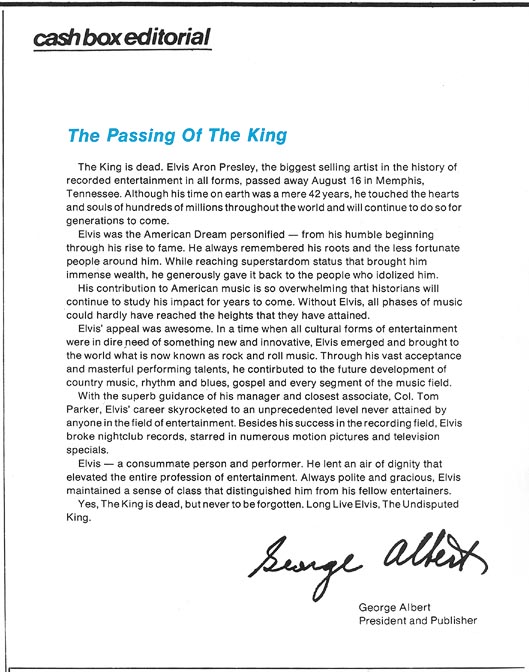 años... ...con motivo de la desaparición de Elvis, el Presidente y Editor de la prestigiosa revista CASHBOX, George Albert, escribió el siguiente editorial para su publicación. Por la SORPRENDENTE vigencia que conserva hoy día, lo hemos elegido como nuestro homenaje al más grande ARTISTA de todos los tiempos al cumplirse hoy el 30° Aniversario de su fallecimiento.