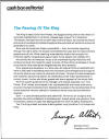 LA DESAPARICION DEL REY El Rey ha muerto. ELVIS ARON PRESLEY, el artista más vendedor en la historia del espectáculo en todas sus formas, falleció el 16 de Agosto en Memphis, Tennessee. A pesar de que su tiempo sobre la Tierra fue de sólo 42 años, conmovió los corazones y almas de millones de personas en todo el mundo, y lo seguirá haciendo en las generaciones venideras. Elvis fue EL SUEÑO AMERICANO personificado -desde sus humildes orígenes hasta alcanzar el estrellato-. Nunca olvidó sus raíces ni a aquellos menos afortunados que él. Alcanzar el super estrellato le dio una riqueza inmensa, que él generosamente compartió con la gente que lo idolatraba. Su contribución a la música americana es tan impactante, que los historiadores en todo el mundo analizarán su influencia en los años por venir.